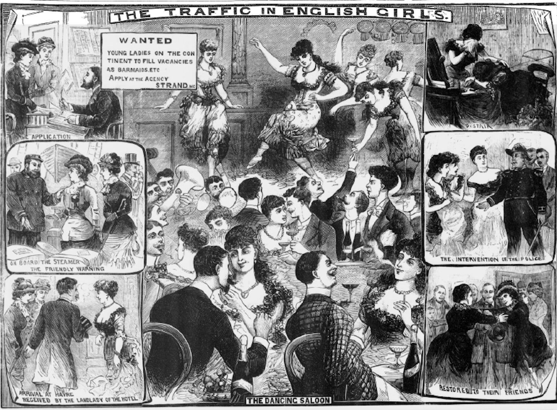 The resulting articles took the reader through the process of recruiting and abusing young women. They portrayed a whole industry devoted to the exploitation of the girls: procurers and brothel-keepers, doctors who “certified” virginity and midwives who ministered to their wounds afterwards.